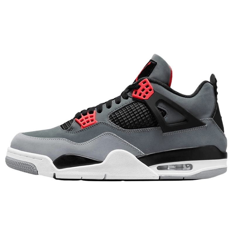 Introducing the Air Jordan 4 Infrared, a sleek and stylish sneaker for your collection. This shoe features a tonal grey Durabuck upper with black TPU mesh inserts, tech straps, and heel tabs. The lacing system and woven Jordan Flight tongue label pop with hits of Infrared, adding a striking contrast to the neutral-toned base. A white sole with visible Air units completes the design, making this sneaker a must-have.