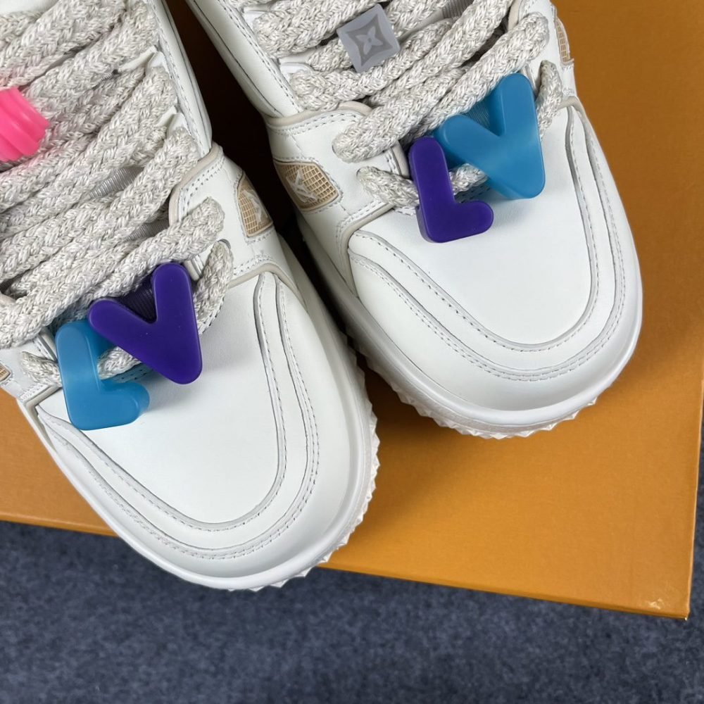 Crafted with meticulous attention to detail, the upper of these sneakers is made from luxurious calf leather, exuding an air of opulence and sophistication. The thick textile laces are adorned with vibrant and eye-catching beads, showcasing iconic Louis Vuitton signatures and adding a playful touch to the design.